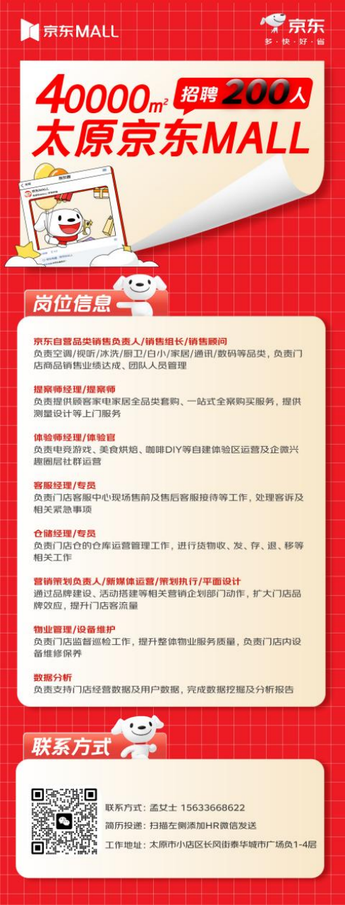 該項(xiàng)目的落地建設(shè)也標(biāo)志著京東線下自營大店又新進(jìn)一省。太原京東MALL同時在本地啟動大規(guī)模員工招聘,包括銷售顧問、提案師、體驗(yàn)官、客服、倉儲管理、營銷策劃、物業(yè)管理、數(shù)據(jù)分析等崗位正在招聘中。