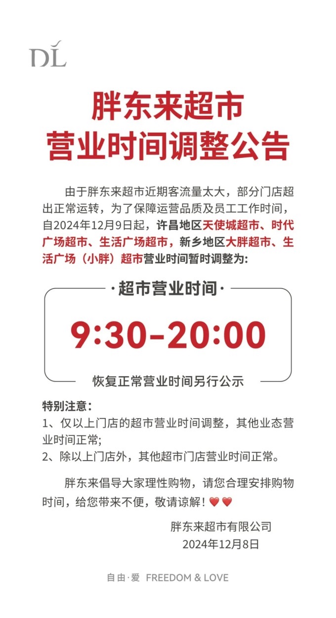 12月8日,胖東來發(fā)布公告稱,由于胖東來超市近期客流量太大,部分門店超出正常運轉(zhuǎn),為了保障運營品質(zhì)及員工工作時間,自2024年12月9日起,許昌地區(qū)天使城超市、時代廣場超市、生活廣場超市,新鄉(xiāng)地區(qū)大胖超市、生活廣場(小胖)超市營業(yè)時間暫時調(diào)整為9:30-20:00,恢復正常營業(yè)時間另行公示。