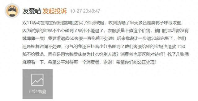 今年1月16日,一位消費者投訴稱他給孩子購買了保姆鵝羽絨服。但孩子穿上后卻發(fā)現(xiàn)羽絨服里面選的絨太次有絨梗,絨梗很硬,而且羽絨服面料太薄,像紙一樣薄,導致絨梗把面料扎破一個洞。隨后消費者聯(lián)系了客服希望可以退貨退款,但客服卻用各種理由搪塞,并以穿過為由進行拒絕。在申請?zhí)詫毠俜浇槿牒螅M者雖然把物品退了回去,卻遲遲沒能收到退款。