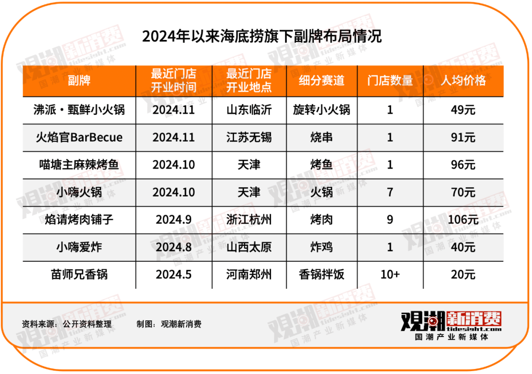 今年下半年,海底撈已經(jīng)開(kāi)業(yè)了6家副牌。在今年8月海底撈宣布實(shí)施“紅石榴計(jì)劃”之后,能明顯感覺(jué)到海底撈的副牌開(kāi)店進(jìn)程加速,在本身的火鍋主業(yè)之外,還覆蓋烤肉、烤魚(yú)、炸雞等多個(gè)品類。