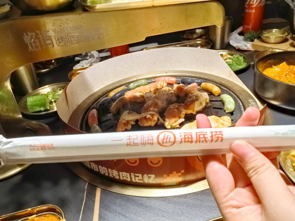 焰請(qǐng)烤肉鋪?zhàn)又袠?biāo)有海底撈字樣的吸管