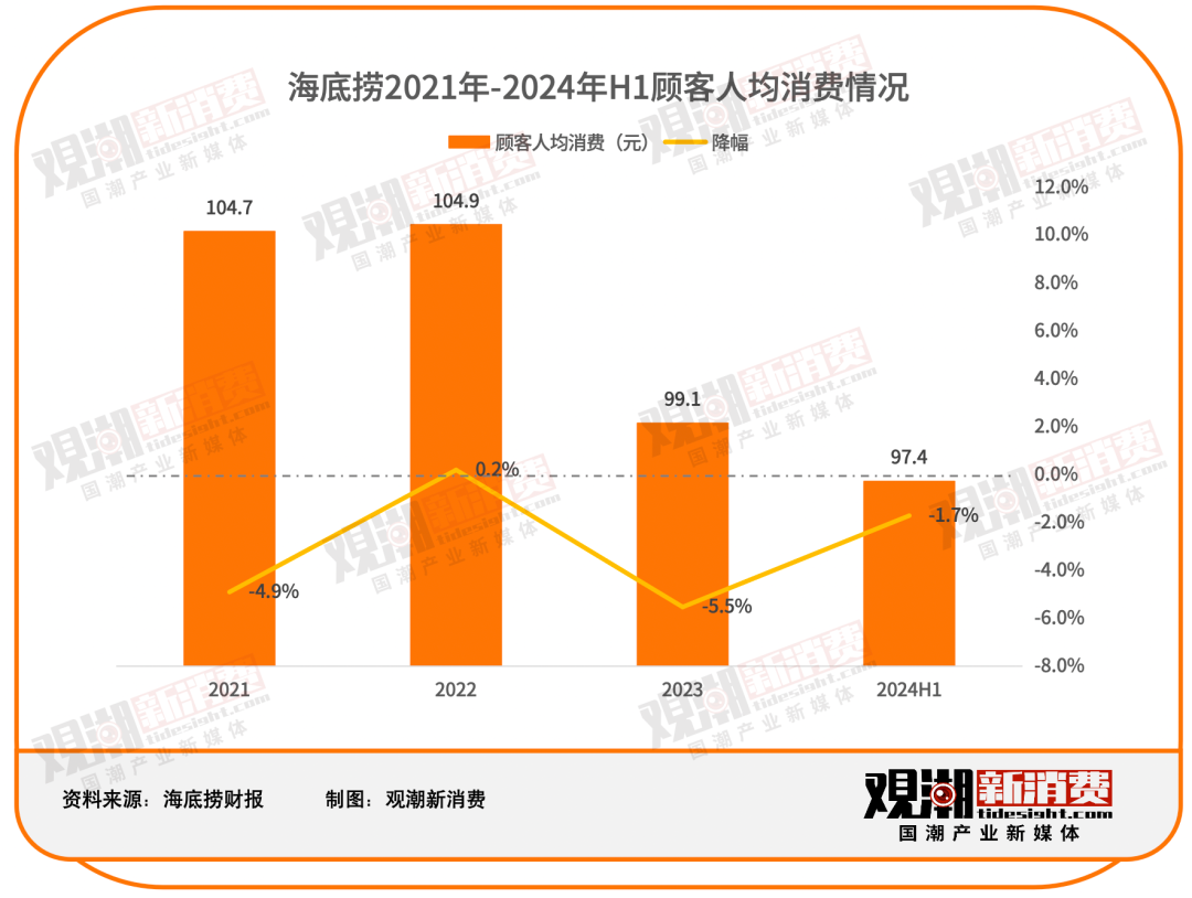 2023年,海底撈的人均消費(fèi)跌至百元以下,2024年上半年更是進(jìn)一步走低,至97.4元。
