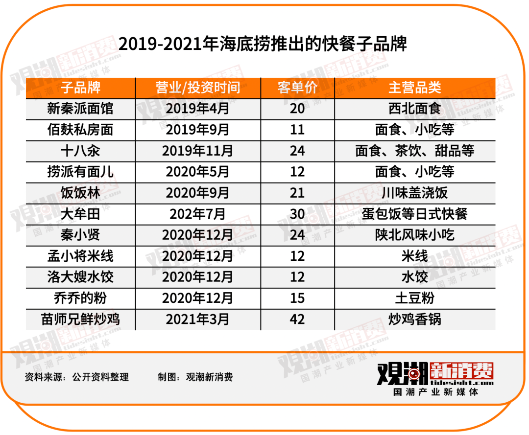 不知是不是U鼎冒菜的失敗激起了海底撈的勝負(fù)心。在2019-2021年這三年間,海底撈持續(xù)布局快餐賽道,推出了十個(gè)子品牌,覆蓋面食、簡(jiǎn)餐、小吃等多個(gè)快餐品類。