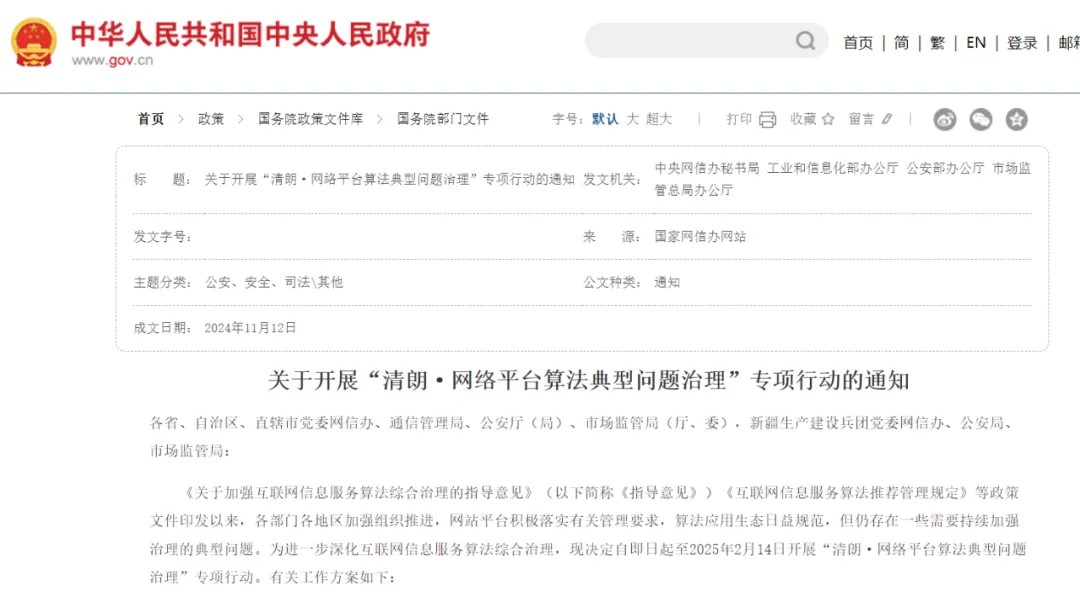 日前,國家市場監(jiān)督管理總局辦公廳、公安部辦公廳、中央網(wǎng)信辦以及工信部等四部門聯(lián)合宣布,自即日起至2025年2月14日,將開展“清朗·網(wǎng)絡(luò)平臺算法典型問題治理”專項行動(下稱“清朗行動”),劍指“信息繭房”、大數(shù)據(jù)殺熟等典型算法問題。