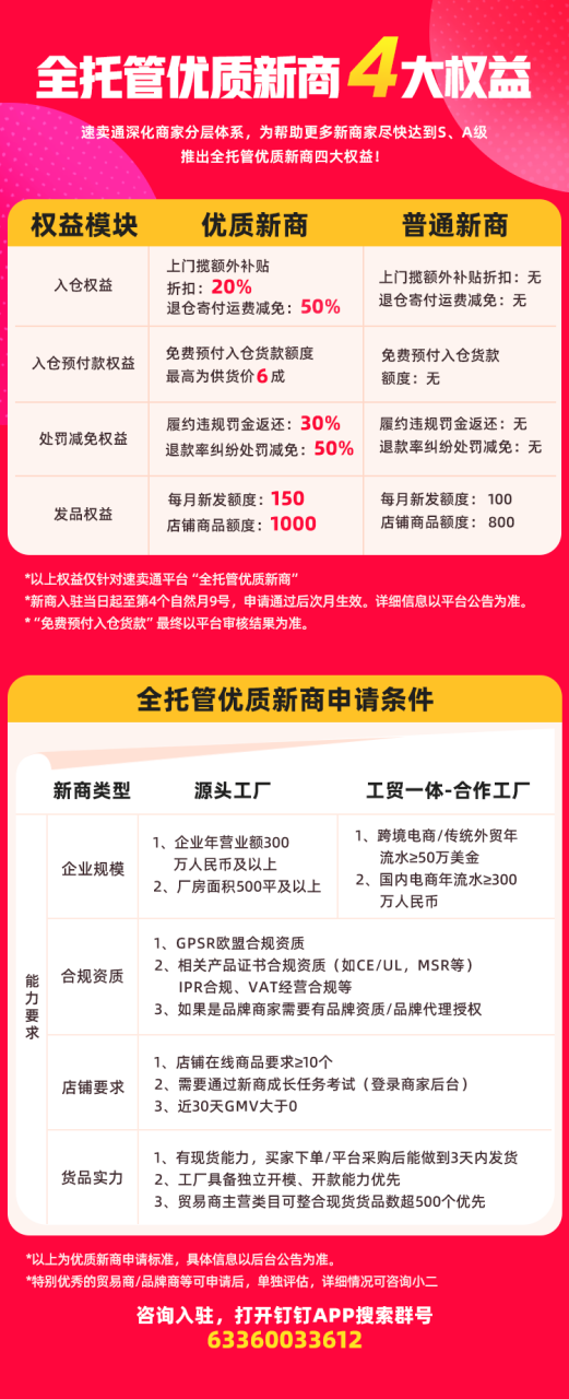對(duì)于全托管優(yōu)質(zhì)新商家,尤其是工廠型、工貿(mào)一體型商家,可以享受到額外發(fā)品額度、20%-50%的運(yùn)費(fèi)補(bǔ)貼、30-50%的處罰減免、以及最高供貨價(jià)6成的預(yù)付款額度。