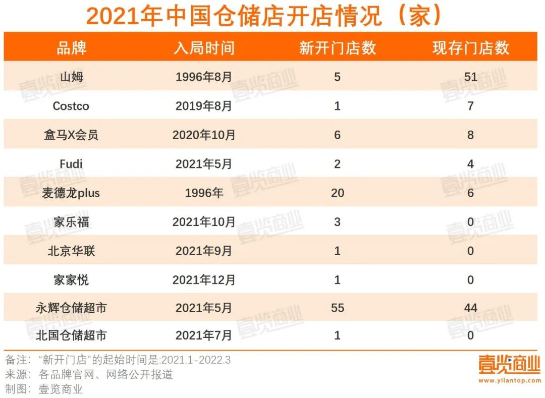 于是,倉儲會員店的第二波“熱潮”興起,并在2021年迎來大爆發(fā)。這一年,除山姆、Costco等外資企業(yè)加速擴(kuò)張外,包括永輝超市、Fudi、家家悅、家樂福等多家本土實(shí)體零售企業(yè)也紛紛入局。據(jù)壹覽商業(yè)不完全統(tǒng)計(jì),從2021年到2022年3月底,全國新開業(yè)倉儲店超過100家。