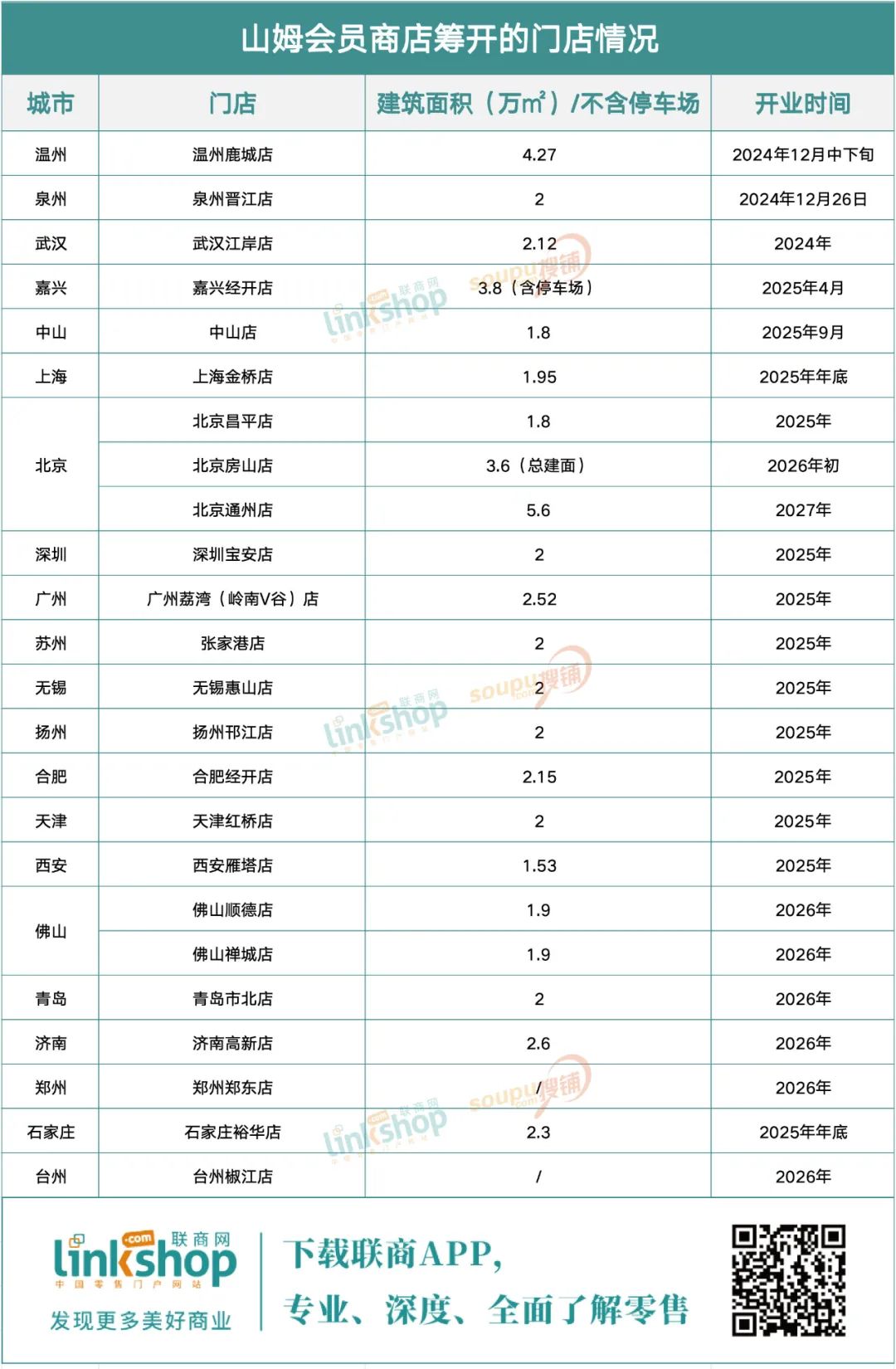 據(jù)《聯(lián)商網(wǎng)》統(tǒng)計(jì),目前山姆在建及籌開的門店數(shù)量已經(jīng)達(dá)23家,最晚的將于2027年開業(yè)。
