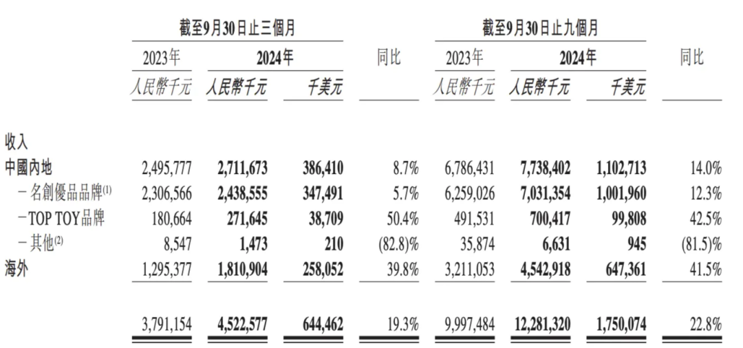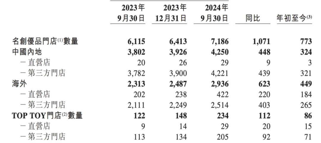 2022年,接受CNBC訪談時,葉國富透露,美國直營店月均銷售額為50萬美元,當年12月收入可達到月均100萬美元,毛利率超50%。截至2024年9月30日,名創(chuàng)優(yōu)品海外直營店422家,同比增加220家,僅在2024年前九個月就新建了184家。TOP TOY和中國內地在2024年新增門店也分別為15家和3家,遠低于海外。