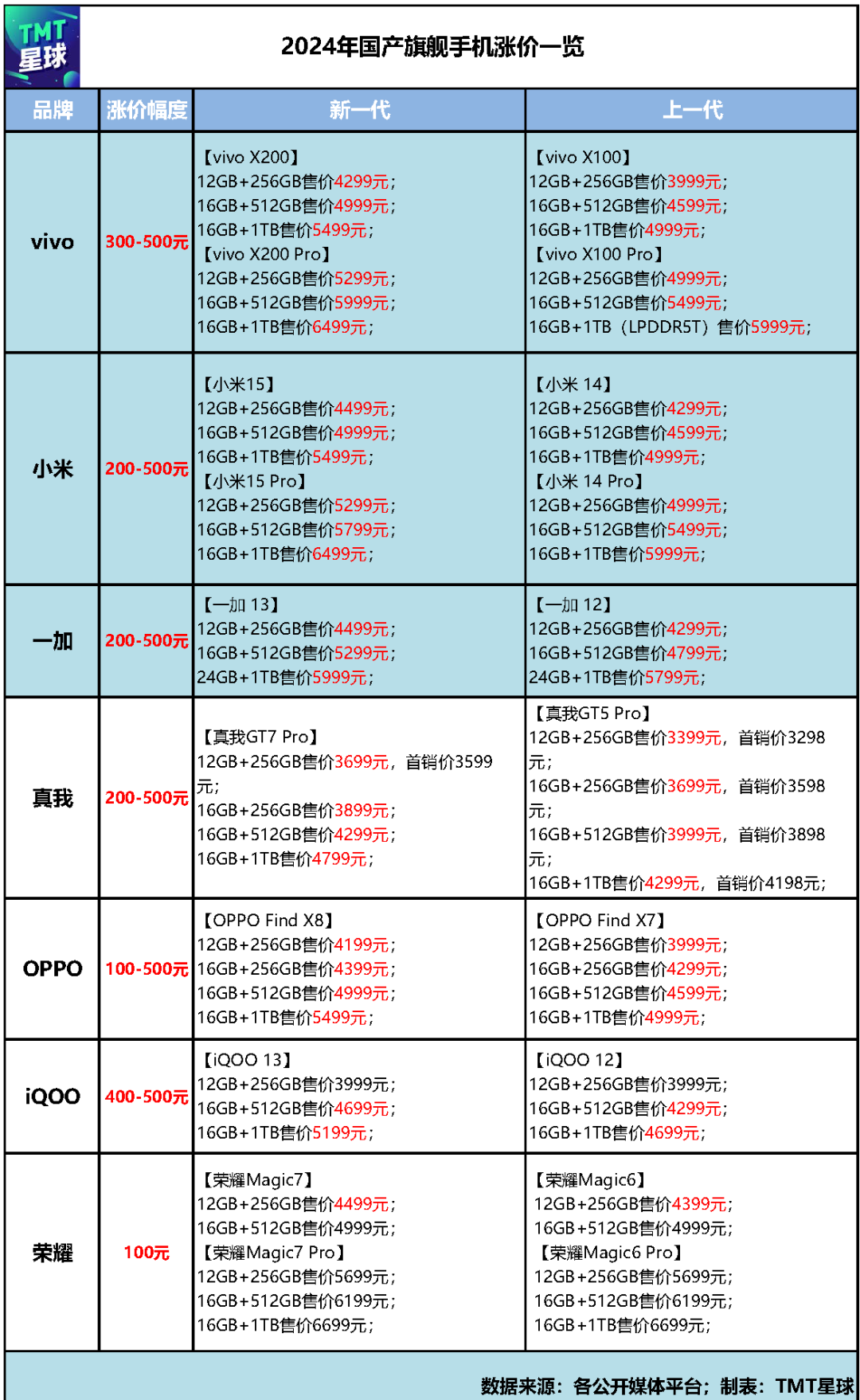 一加13和真我GT7 Pro各版本均漲價(jià)200元-500元;