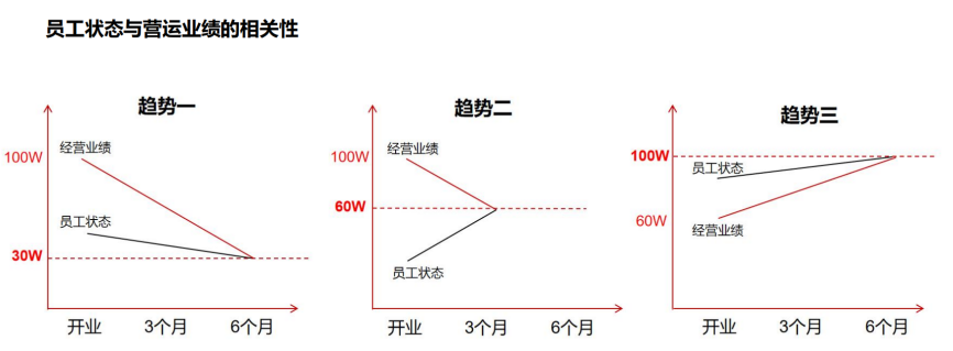 第一種趨勢(shì),我們開業(yè)因?yàn)榕謻|來(lái)的影響力業(yè)績(jī)沖的很高,100萬(wàn)、200萬(wàn),但如果為了業(yè)績(jī)員工沒(méi)有休息、對(duì)員工也沒(méi)有尊重,員工的狀態(tài)還會(huì)下降。結(jié)果就是業(yè)績(jī)跟員工狀態(tài)平衡的交接點(diǎn)可能只有30萬(wàn);如果在30萬(wàn)的時(shí)候員工狀態(tài)還是不行,可能還會(huì)進(jìn)一步下滑,最后回到了調(diào)改前,白忙乎一場(chǎng)。
