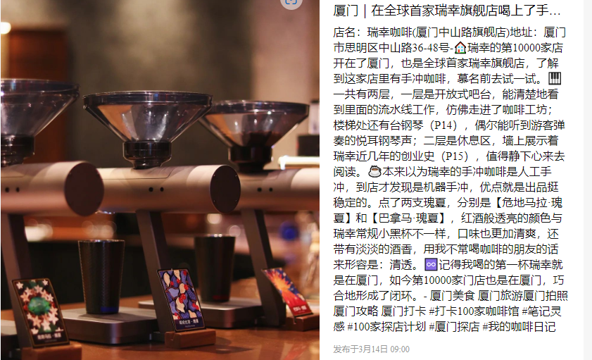 例如,讓咖啡生豆是獨(dú)一無二的——瑞幸深入到埃塞俄比亞的產(chǎn)業(yè)鏈上游「獨(dú)家定制」花魁系列咖啡生豆;再例如,手沖咖啡的門店更為寬敞,配備了鋼琴、流水線工坊、發(fā)展史板塊,還配備了小型烘焙機(jī)和數(shù)字化全自動(dòng)手沖咖啡機(jī)。