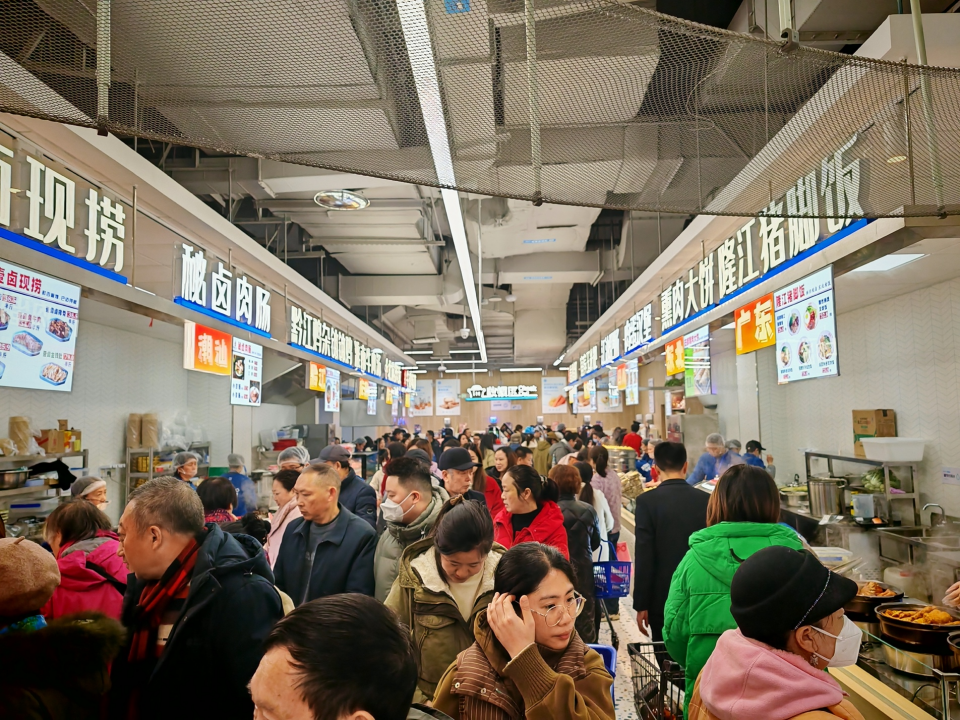 在盒馬鮮生世茂廣場店,不少市民圍在鮮切肉鋪旁,現(xiàn)場的服務員正在按照消費者意愿,現(xiàn)場分割豬肉、羊肉、牛肉;在熟食一條街,匯集全國各地美食,嶺南牛雜、隆江豬腳飯、淮南牛肉湯、熏肉大餅等各具特色。逛完店、買完菜,市民張女士還不忘在門口順便選購一束鮮花,她表示,“澳洲臘梅、銀柳、冬青、小香松……品類太全了。美食滿足了口腹之欲,鮮花則能點綴一天的好心情!