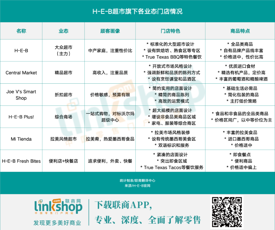 官方資料顯示,H-E-B創(chuàng)立于1905年,目前在美國德州和墨西哥共開設(shè)435家門店,年銷售總額已超430億美元(約3123億人民幣)。其超市業(yè)態(tài)主要包括:高端精品超市、傳統(tǒng)大眾超市和低價折扣超市。為滿足細(xì)分市場需求,該零售商還創(chuàng)新性地開發(fā)了多個特色業(yè)態(tài),具體如下圖所示。