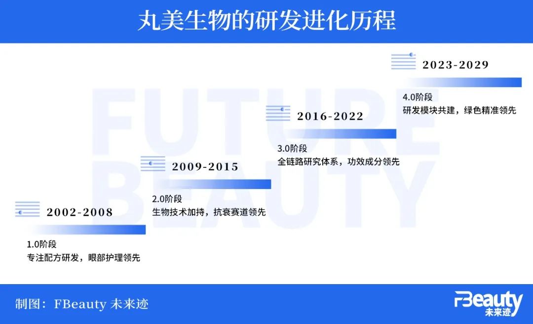 《FBeauty未來跡》經(jīng)過梳理發(fā)現(xiàn),過去22年丸美生物的研發(fā)也已經(jīng)經(jīng)歷了3次重要迭代,目前正在進入4.0時代。