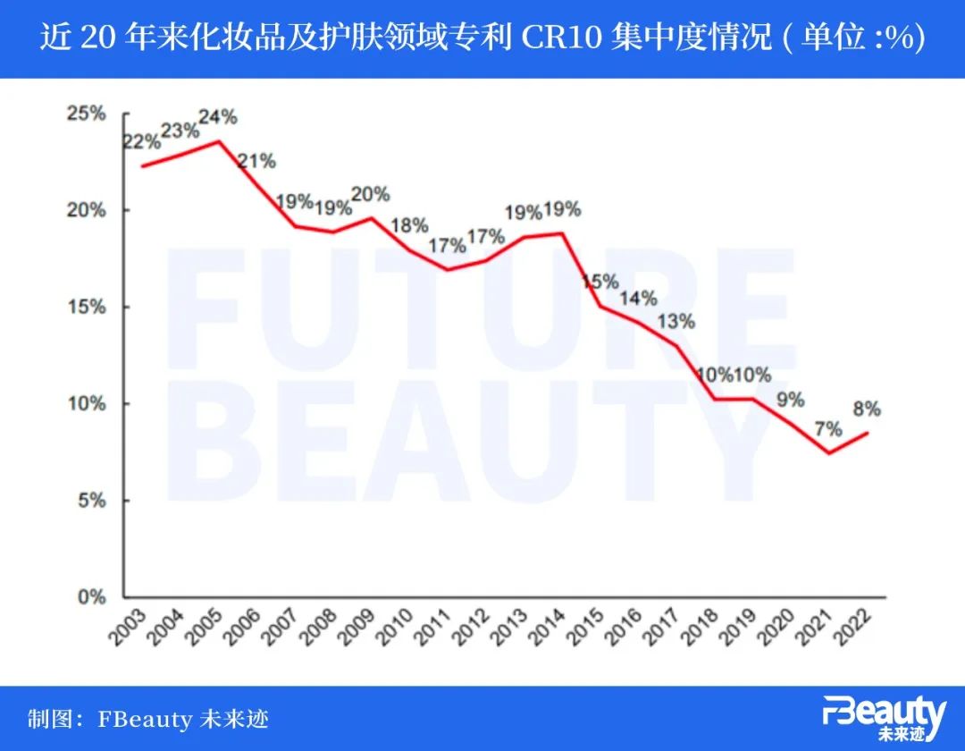 首先是全球化妝品及護膚品領域?qū)@鸆R10的集中度在不斷下降,傳統(tǒng)企業(yè)的壟斷地位正在受到挑戰(zhàn),新興企業(yè)的機會在增加。[3]