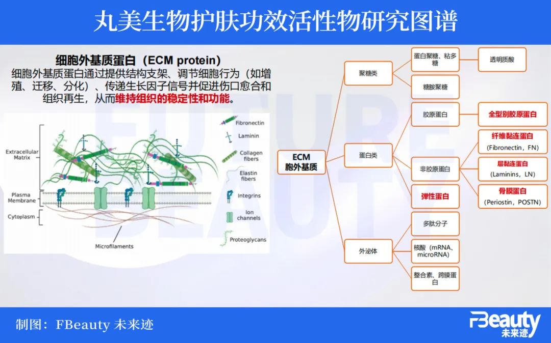 據(jù)《FBeauty未來跡》了解,丸美生物對護膚功效活性物的研究已經(jīng)開始拓展到所有主要細胞外基質(zhì)蛋白(ECM protein)。除了包括目前市面上大熱的透明質(zhì)酸、膠原蛋白、多肽等活性成分之外,還包括剛獲得諾貝爾獎的小分子核糖核酸(miRNA)。