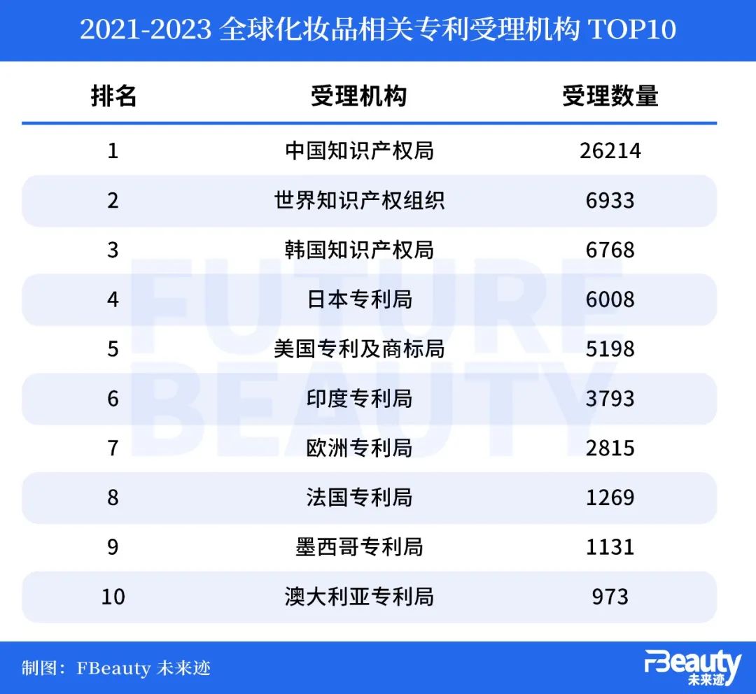 “智慧芽”的檢索數(shù)據(jù)顯示,2021年至2023年的三年間,全球范圍內(nèi)所申請的化妝品相關專利數(shù)量為67997條,涉及全球170多個國家和地區(qū)。其中中國過去三年共接到26214件和化妝品相關的專利申請,以壓倒性優(yōu)勢位居全球第一,占全球總量的38.55%。