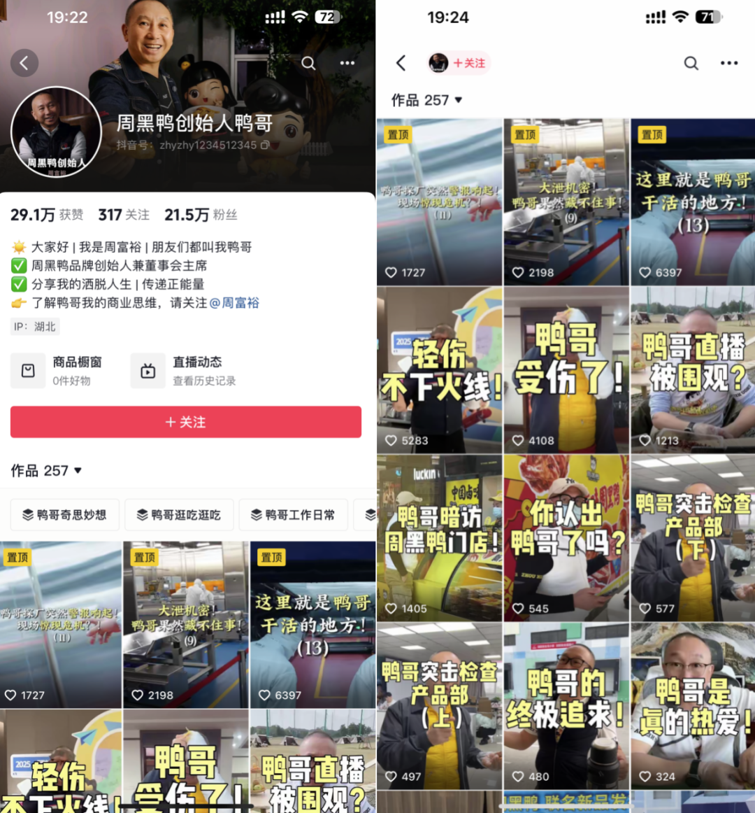 此后,周富裕頻繁活躍于社交平臺(tái)中,截至12月12日晚19時(shí),其抖音賬號(hào)“周黑鴨創(chuàng)始人鴨哥”已發(fā)布257條作品,粉絲達(dá)21.5萬(wàn)人。