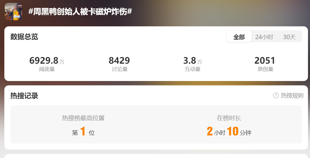 12月11日,話題“周黑鴨創(chuàng)始人被卡磁爐炸傷”登上微博熱搜第一。