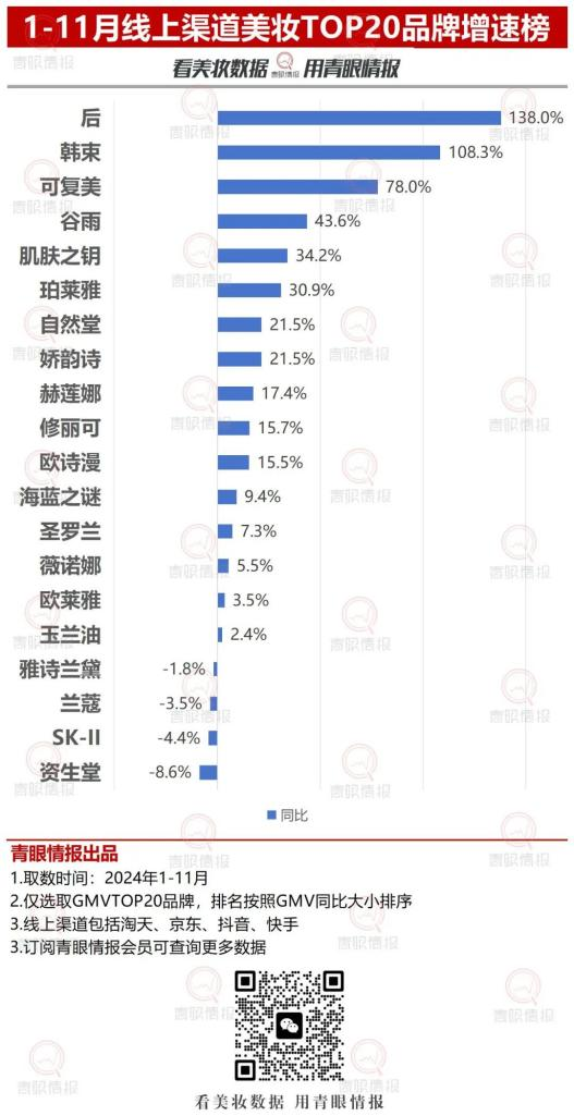雖然,從絕對GMV上,上述外資品牌的成績遠遠超過了當下大部分的國貨品牌。但同時,青眼也注意到,從線上渠道來看,雅詩蘭黛、蘭蔻、SK-II、資生堂品牌均為負增長,其中資生堂甚至下滑了8.6%。