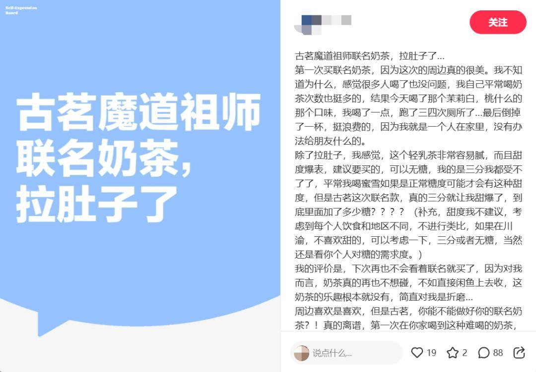 還有網友稱,喝完古茗聯(lián)名款奶茶后出現(xiàn)了拉肚子、心悸的癥狀,“古茗聯(lián)名魔道祖師的奶茶,三分甜就覺得非常膩,喝了一半跑了好幾趟廁所!