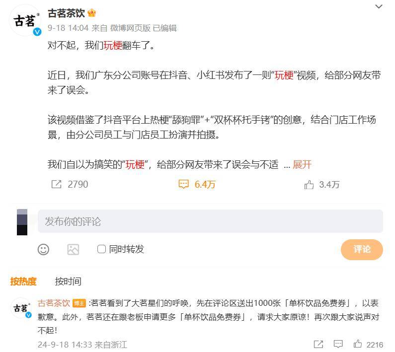 除了聯(lián)名上的爭議,今年更影響古茗口碑的事件是還有“3·15期間”曝光的食品衛(wèi)生問題以及“玩梗翻車”。今年“3·15期間”,古茗有門店被曝出替換過期食材的標簽;9月份,古茗發(fā)布員工手戴紙手銬、紙牌罪名的視頻,被批評是“侮辱打工人”。