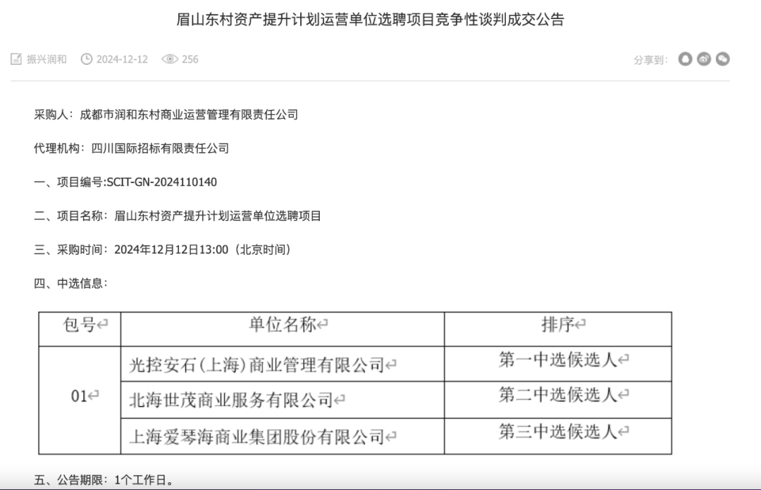 根據(jù)報(bào)道中的截圖顯示,光大安石(上海)商業(yè)管理有限公司成為了項(xiàng)目的第一中選人,同時(shí)北海世茂商業(yè)服務(wù)有限公司和上海愛琴海商業(yè)集團(tuán)也參與了競選。