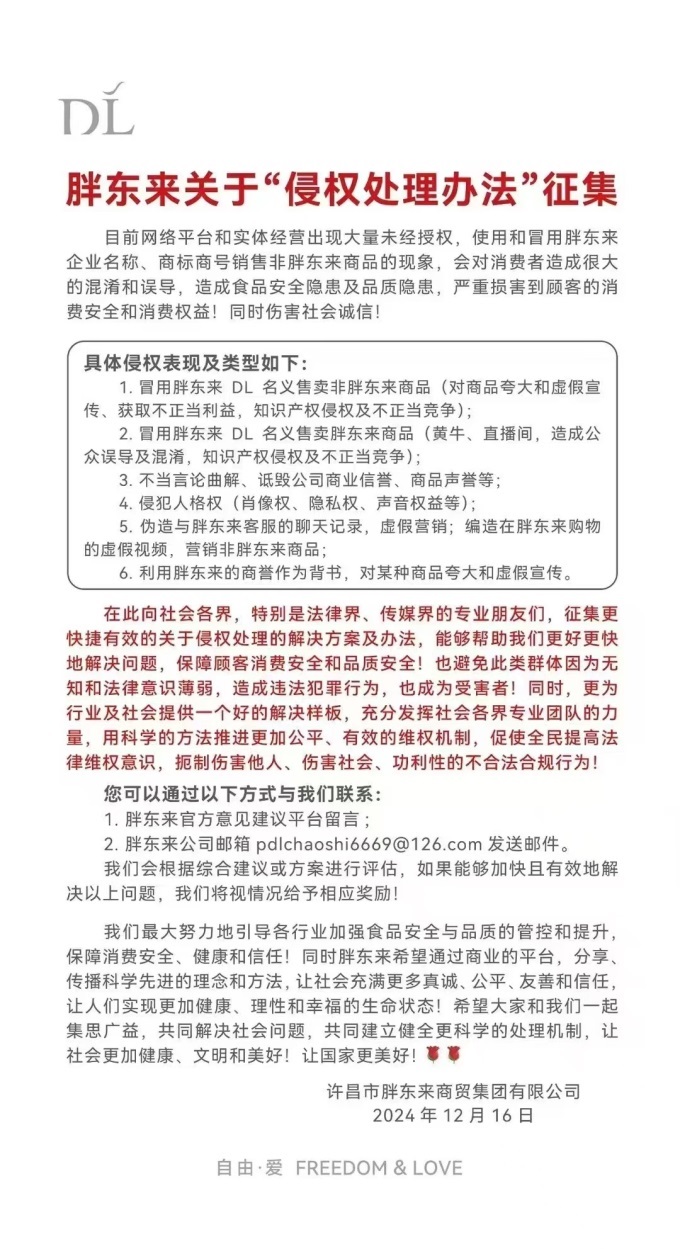 12月16日,胖東來在官方微信賬號發(fā)文,征集關(guān)于“侵權(quán)處理辦法”的意見。