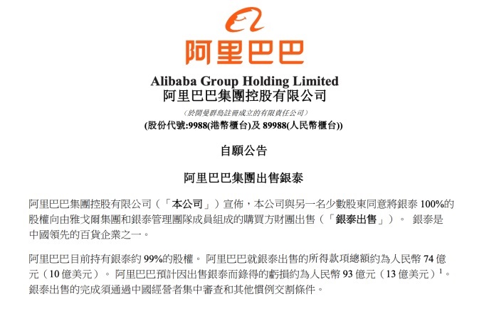 聯(lián)商快訊:12月17日,阿里巴巴集團(tuán)發(fā)布公告,同意將所持全部銀泰股權(quán)以約74億元人民幣向雅戈?duì)柤瘓F(tuán)和銀泰管理團(tuán)隊(duì)成員組成的買(mǎi)方財(cái)團(tuán)出售(約占銀泰股權(quán)的99%)。這意味著阿里巴巴將面向未來(lái)持續(xù)聚焦核心主業(yè)。同時(shí),阿里方面表示,期待銀泰在雅戈?duì)柤瘓F(tuán)的支持下繼續(xù)創(chuàng)業(yè),打開(kāi)更大發(fā)展空間。