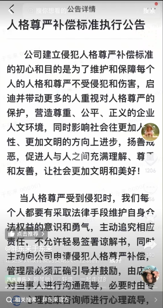 公告稱,當人格尊嚴受到侵犯時,我們每個人都要有采取法律手段維護自身合法權(quán)益的意識和勇氣,主動追究相應(yīng)責任,不允許輕易簽署諒解書,同時主動向公司申請侵犯人格尊嚴補償,管理層必須正確引導并鼓勵,由店長對當事人進行溝通疏導,必要時由專業(yè)心理健康咨詢師進行心理疏導,減輕因人格尊嚴受到侵害后對員工心理造成的傷害。