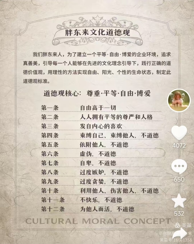 同時,于東來還公布了胖東來文化道德觀,道德觀核心是尊重、平等、自由、博愛,包括“自由高于一切”“人人擁有平等的尊嚴和人格”“發(fā)自內(nèi)心的喜歡”“束縛自己、束縛他人,不道德”等。