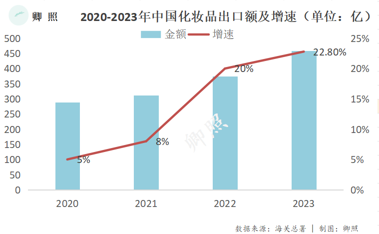 當(dāng)然,這一現(xiàn)象早在去年就很顯著了,據(jù)央視財(cái)經(jīng)《經(jīng)濟(jì)信息聯(lián)播》欄目當(dāng)時(shí)的報(bào)道,僅僅2023年前8個(gè)月,中國(guó)化妝品對(duì)韓國(guó)的出口額同比上漲大約190%。且過(guò)去幾年國(guó)產(chǎn)化妝品對(duì)外出口增速明顯,直至2023年全年增速達(dá)到22.8%。