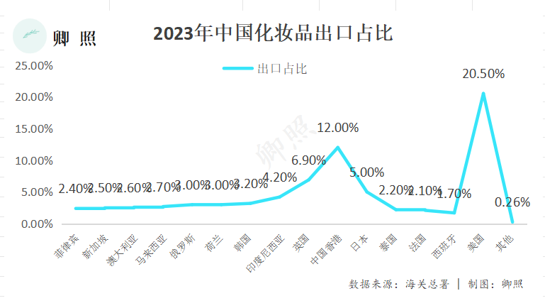 以韓國(guó)為例,一方面,韓國(guó)化妝品市場(chǎng)規(guī)模大,根據(jù)GlobalData曾經(jīng)的預(yù)計(jì),2026年韓國(guó)化妝品市場(chǎng)規(guī)模將增至28.278億韓元(約合169億元人民幣),但在2023年我國(guó)對(duì)外化妝品的出口占比份額僅在3%左右,還有很大的增長(zhǎng)空間。