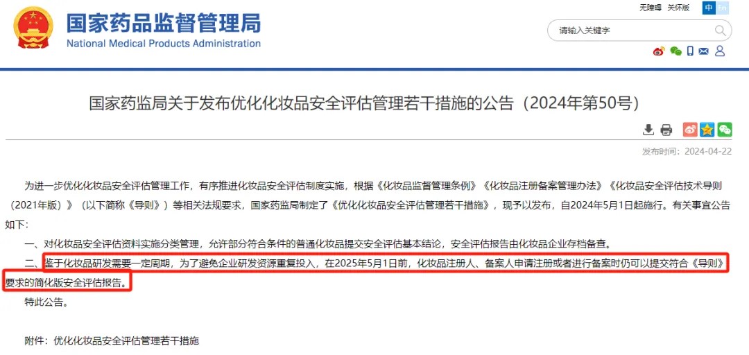 2024年4月22日,國(guó)家藥監(jiān)局官網(wǎng)發(fā)布的《關(guān)于發(fā)布優(yōu)化化妝品安全評(píng)估管理若干措施的公告(2024年第50號(hào))》明確指出,鑒于化妝品研發(fā)需要一定周期,為了避免企業(yè)研發(fā)資源重復(fù)投入,在2025年5月1日前,化妝品注冊(cè)人、備案人申請(qǐng)注冊(cè)或者進(jìn)行備案時(shí)仍可以提交符合《化妝品安全評(píng)估技術(shù)導(dǎo)則(2021年版)》要求的簡(jiǎn)化版安全評(píng)估報(bào)告。