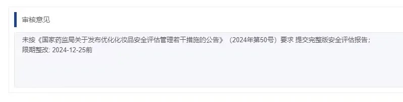 這使得不少企業(yè)備案新品碰了壁。譬如,廣州某企業(yè)備案的一款產(chǎn)品,審核意見(jiàn)要求在2024年12月24日前完成整改:“提交完整版安評(píng)資料(視產(chǎn)品類型提交報(bào)告或基本結(jié)論),其中產(chǎn)品穩(wěn)定性、包材相容性、防腐挑戰(zhàn)實(shí)驗(yàn)評(píng)估在對(duì)應(yīng)模版可先提交序時(shí)研究進(jìn)展情況(試驗(yàn)方法、實(shí)驗(yàn)計(jì)劃、現(xiàn)階段測(cè)試結(jié)果)”,原因是“你單位是廣州市的頭部化妝品企業(yè),在安評(píng)工作中應(yīng)當(dāng)率先執(zhí)行國(guó)家的政策規(guī)定”。
