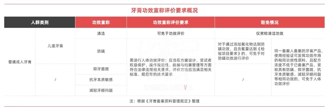 按照要求,除了特定的豁免情況,牙膏備案人按照國(guó)家標(biāo)準(zhǔn)、行業(yè)標(biāo)準(zhǔn)進(jìn)行功效評(píng)價(jià)后,方可宣稱防齲、抑牙菌斑、抗牙本質(zhì)敏感、減輕牙齦問(wèn)題等功效。其中,兒童牙膏可以宣稱的功效類別僅限于清潔、防齲。
