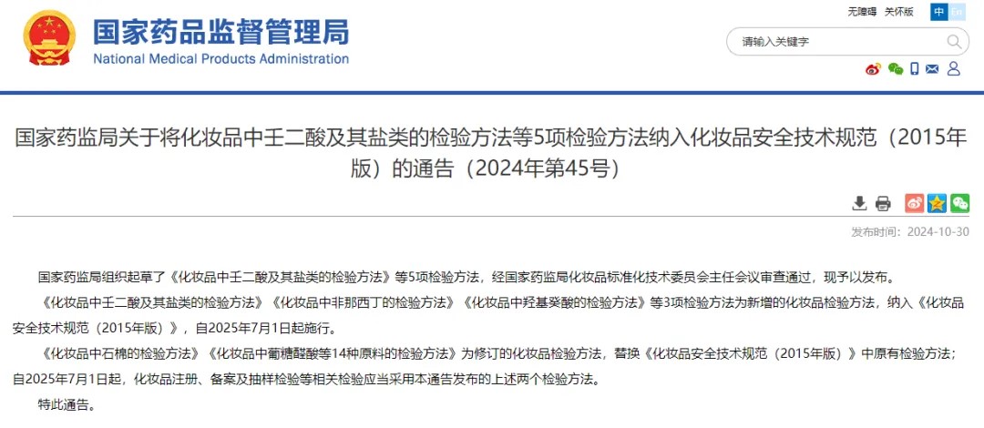 2024年10月30日,國(guó)家藥監(jiān)局發(fā)布《關(guān)于將化妝品中壬二酸及其鹽類的檢驗(yàn)方法等5項(xiàng)檢驗(yàn)方法納入化妝品安全技術(shù)規(guī)范(2015年版)的通告(2024年第45號(hào))》,新增《化妝品中壬二酸及其鹽類的檢驗(yàn)方法》《化妝品中非那西丁的檢驗(yàn)方法》《化妝品中羥基癸酸的檢驗(yàn)方法》3項(xiàng)檢驗(yàn)方法,自2025年7月1日起實(shí)施;修訂《化妝品中石棉的檢驗(yàn)方法》《化妝品中葡糖醛酸等14種原料的檢驗(yàn)方法》兩項(xiàng)檢驗(yàn)方法,自2025年7月1日起實(shí)施。
