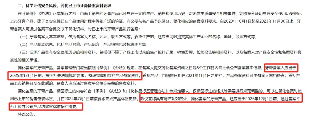 2.除僅宣稱具有清潔功效的外,簡(jiǎn)化備案的牙膏產(chǎn)品,還應(yīng)當(dāng)于2025年12月1日前,通過(guò)備案平臺(tái)上傳并公布產(chǎn)品功效宣稱依據(jù)的摘要。