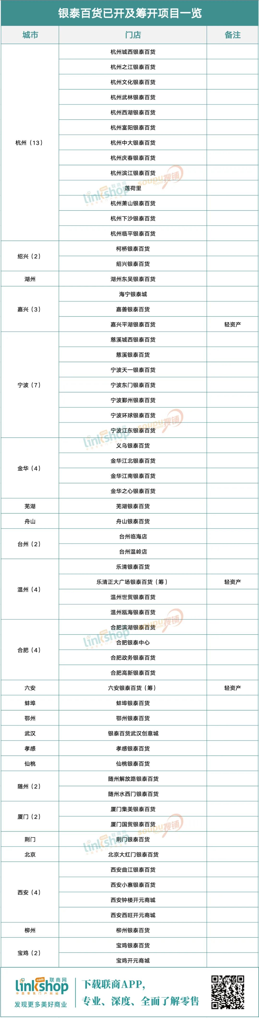 據(jù)《聯(lián)商網(wǎng)》統(tǒng)計(jì),目前銀泰百貨已經(jīng)在全國(guó)布局了64家門店,包括了5個(gè)輕資產(chǎn)項(xiàng)目,其中南昌八一廣場(chǎng)銀泰百貨、揚(yáng)州銀泰百貨兩個(gè)輕資產(chǎn)商業(yè)計(jì)劃在2025年開業(yè)。