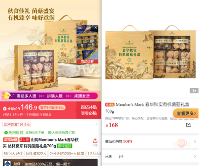 目前,拼多多也進入了代購賽道,培育用戶最低價供給端的心智。比如700g的MM春華秋實有機菌菇禮盒,非會員價是201.6元,會員價是168元,而在拼多多,直接對會員價打八七折,只需146.9元便可拿下。