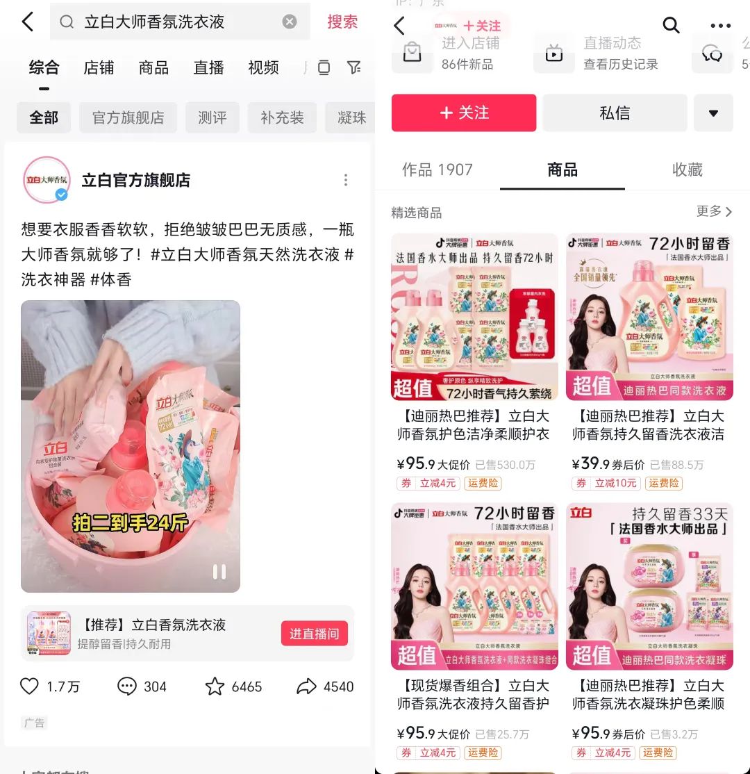 此外,立白星圖以及品牌站外品宣聯(lián)動種草,提升了“立白”“立白大師香氛洗衣液”的搜索詞熱度。同時站內(nèi)立白將商品卡與KOC種草鏈接無縫銜接,根據(jù)消費(fèi)者喜好新增產(chǎn)品套組,加大了全域推廣力度,高效承接搜索的潑天流量,實(shí)現(xiàn)貨架場同比增長11.5%。