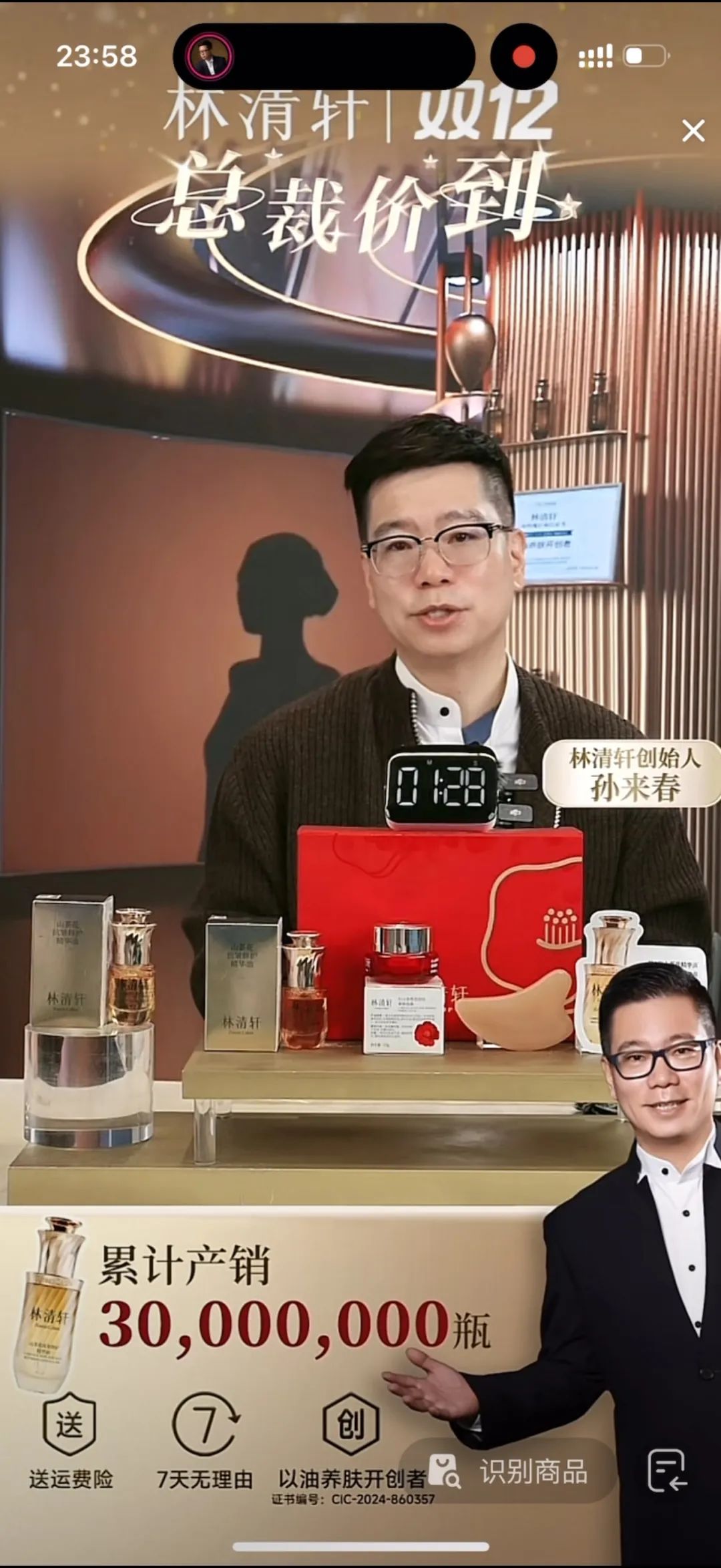 比如雙12當(dāng)天,用戶進(jìn)入林清軒的直播間,便會發(fā)現(xiàn)創(chuàng)始人孫來春坐鎮(zhèn)直播間,給大家派送福利。通過孫總親自下場帶貨,加上品牌十年精華油全國銷售額第一的口碑背書,林清軒的業(yè)績增長了134%,可見“人”的鮮活魅力,往往能讓傳統(tǒng)品牌煥發(fā)新活力。