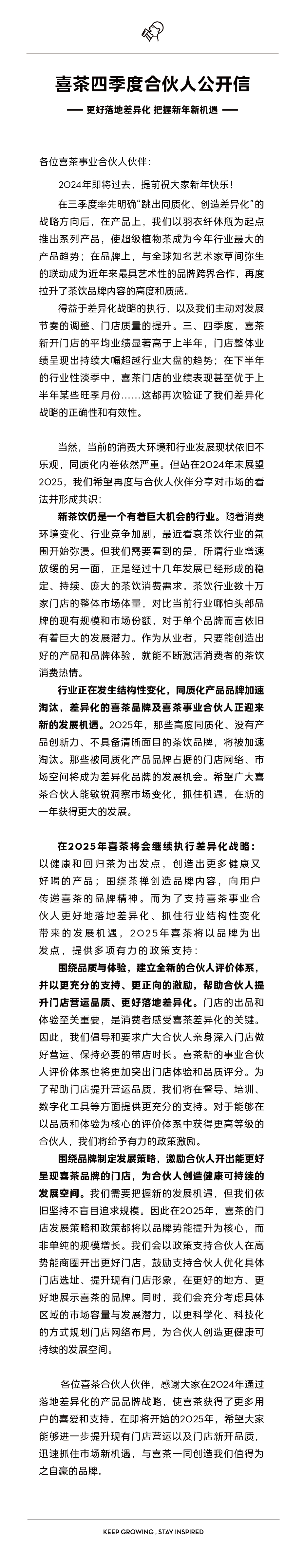 12月19日,喜茶向事業(yè)合伙人發(fā)布了主題為《更好落地差異化 把握新年新機(jī)遇》的第四季度公開信。