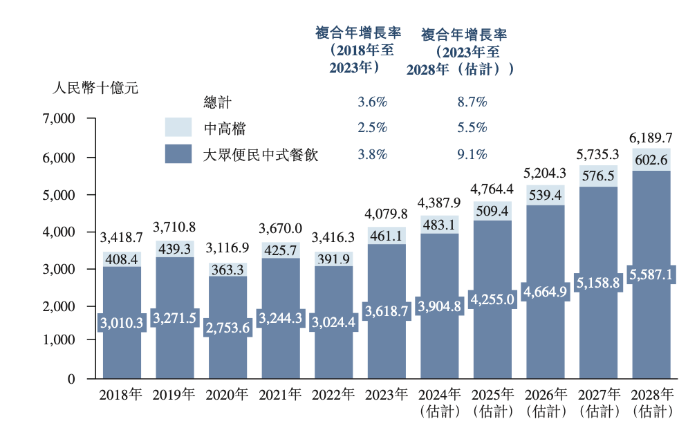 小菜園在招股書中提到,預(yù)計(jì)中餐市場(chǎng)規(guī)模于2028年達(dá)到6.19萬(wàn)億元,2023年—2028年的年復(fù)合增長(zhǎng)率約為8.7%;其中大眾便民中式餐飲市場(chǎng)規(guī)模于2028年達(dá)到5.59萬(wàn)億元,2023年—2028年的年復(fù)合增長(zhǎng)率約為9.1%。