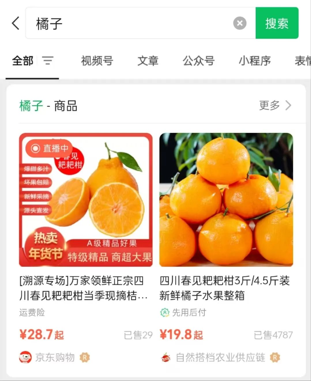 盡管用戶可以在訂閱號(hào)、直播等場(chǎng)景下刷到小店,但若要主動(dòng)進(jìn)入微信小店,比較簡(jiǎn)單的方法是,直接在微信搜索框內(nèi)搜索商品關(guān)鍵詞(比如在微信內(nèi)搜索“橘子”“蘋果”等等)。