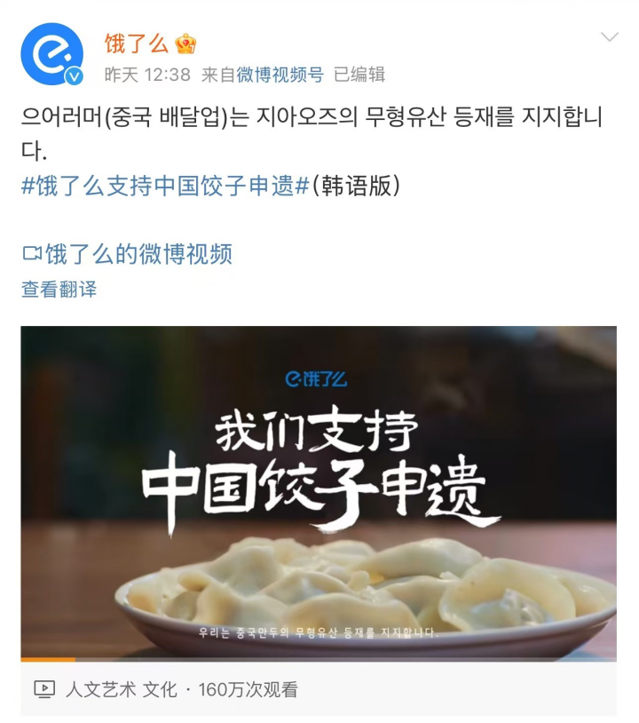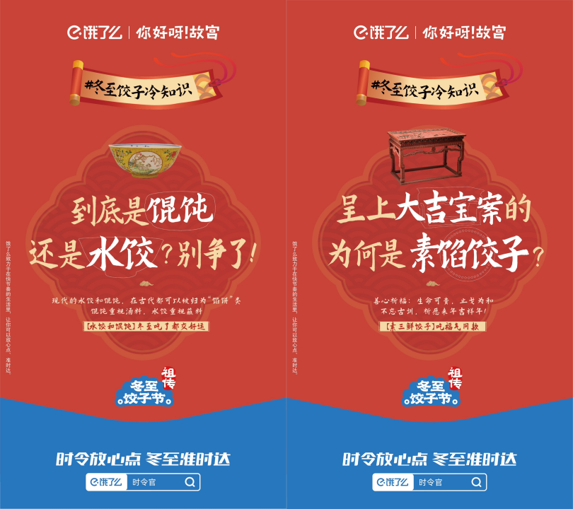 今年冬至前夕,餓了么時(shí)令官上線“祖?zhèn)鞫溜溩庸?jié)”活動(dòng),聯(lián)合「你好呀!故宮」為年輕人趣味講述古人吃餃子的冷知識(shí),同時(shí)推出日歷、餐墊等聯(lián)名周邊等。在冬至文化宣傳片中,餓了么帶網(wǎng)友一起回顧餃子在中國(guó)的歷史,并主張“支持中國(guó)餃子申遺”,在社交媒體及韓國(guó)網(wǎng)友中引起火熱討論。冬至當(dāng)天,餓了么聯(lián)合商家推出3萬份大牌免單,并為感謝網(wǎng)友支持申遺,新增1萬份餃子免單。