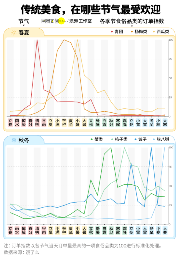 除了冬至吃餃子,《年輕人時(shí)令消費(fèi)趨勢(shì)》顯示,年輕人對(duì)時(shí)令食物的消費(fèi)趨勢(shì)和文化認(rèn)同緊密相連,仍然延續(xù)了傳統(tǒng)的節(jié)慶習(xí)俗。例如紀(jì)念先人、表達(dá)思念的青團(tuán)在清明時(shí)令的訂單量最高;西瓜、楊梅也是夏日不可或缺的時(shí)令特色;霜降吃柿子、秋分享品蟹,一起構(gòu)成秋日重要的“儀式感”;隆冬時(shí)節(jié),火鍋外賣溫暖了寒冬中的年輕人,餃子、臘八粥共同承載著悠久的文化記憶。