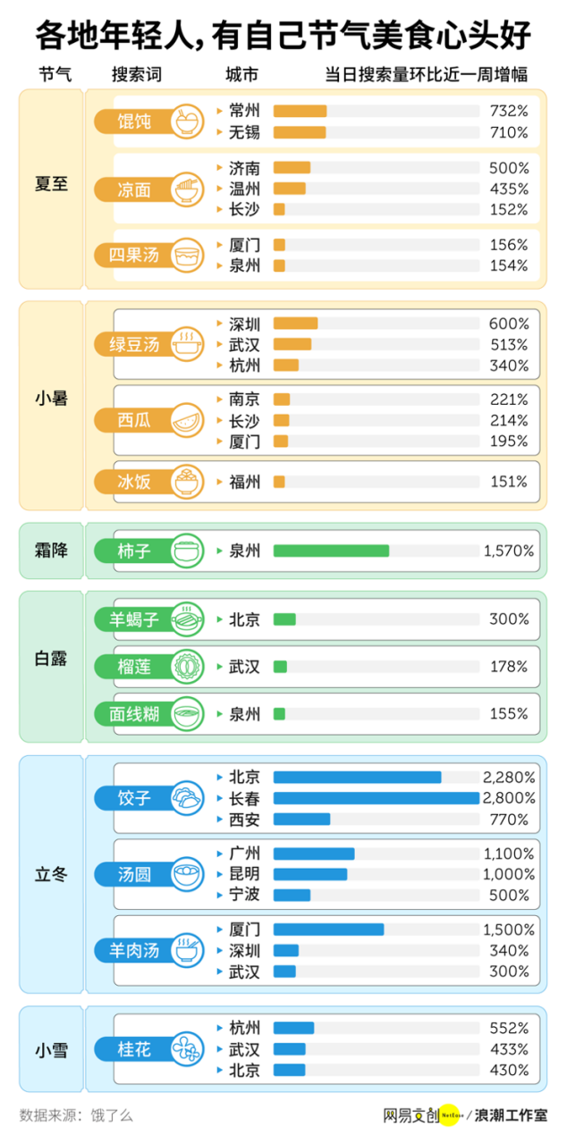 像夏至?xí)r節(jié),濟(jì)南、溫州等大部分城市的年輕人多會(huì)選擇用咸鮮清爽的涼面解暑,但在泉州和廈門,四果湯的當(dāng)日搜索量環(huán)比近一周均增長(zhǎng)超過150%。立冬的南北差異則更加明顯,西安、長(zhǎng)春等北方城市讓餃子在這一天成為“頂流”,但在廣州、寧波等地,大家更加偏愛湯圓。在深圳、武漢等城市,儀式感是一碗暖呼呼的羊肉湯。