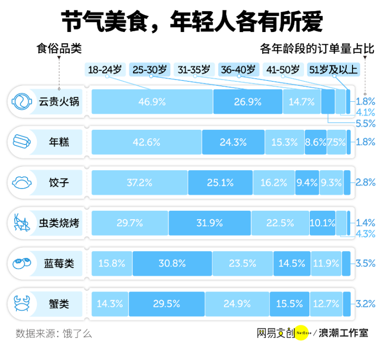 帶火“新食俗”離不開“Z世代”,他們?nèi)谌肓藥в袝r(shí)代印記的生活方式,創(chuàng)造出個(gè)性化的消費(fèi)行為。例如驚蟄有“除百蟲”的民俗活動(dòng),云南一些傣族村落,至今還保留著吃蟲的習(xí)俗。通過餓了么時(shí)令官的內(nèi)容營(yíng)銷,蟲類燒烤在今年驚蟄期間的銷售量明顯上升,其中18-35歲的年輕人貢獻(xiàn)了84%的訂單量。云貴火鍋、花式年糕等時(shí)興的美食,“00后”年輕人的消費(fèi)占比也遠(yuǎn)超其他年齡段,成為這一趨勢(shì)的主要推動(dòng)力。