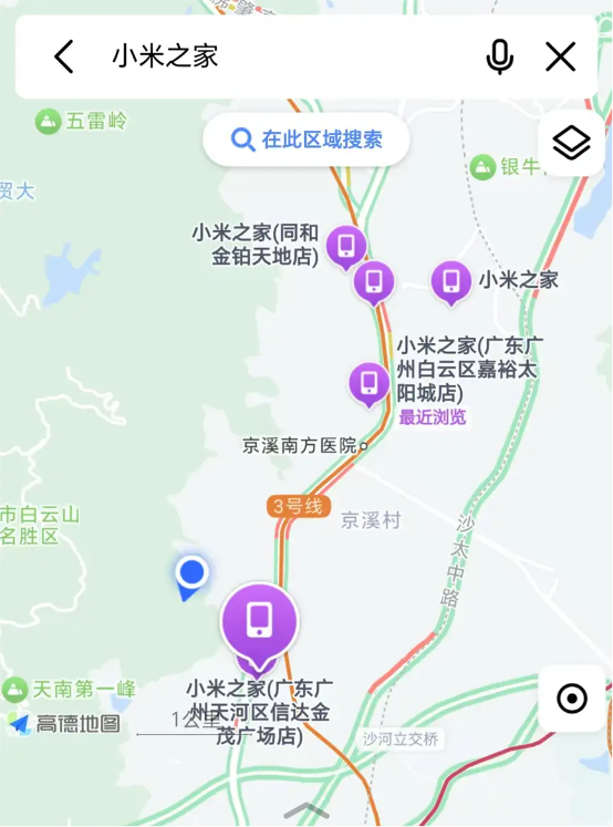 在盧偉冰的描述中,小米空調(diào)、冰箱、洗衣機(jī)都受益于小米線下渠道的拓展。為此,「定焦One」于12月下旬走訪了廣州市白云區(qū)附近的小米之家門(mén)店,直線距離不超過(guò)5公里的范圍內(nèi)就有6家小米之家,其中1家還在裝修待開(kāi)業(yè)。它們大多集中在商業(yè)廣場(chǎng),也有開(kāi)在主干道路邊顯眼處。